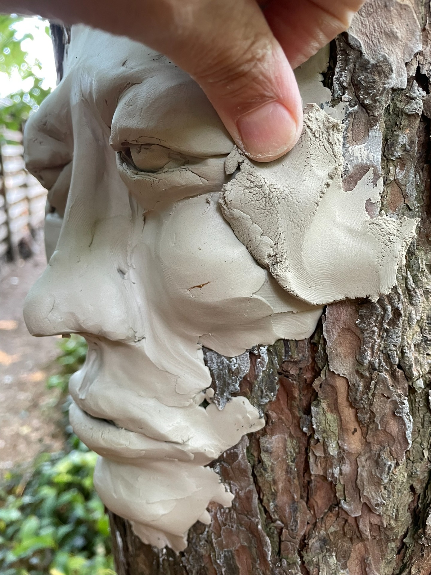 De boom als spiegel. (gezicht boetseren tegen een boom in open lucht)